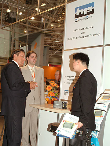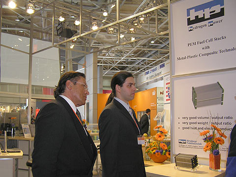 For the first time Michael Martin (left) und Franz Martin (right) proudly present their PEM Fuel Cell technology at the Group Exhibit Hydrogen + Fuel Cells, HANNOVER FAIR 2005.