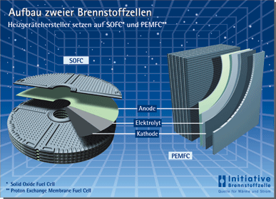 Wenn es voraussichtlich im nächsten Jahrzehnt Brennstoffzellen für den privaten Heizungskeller gibt, werden diese nach derzeitigem Stand der Technik SOFC- oder PEMFC-Geräte sein. Die Initiative Brennstoffzelle (IBZ) informiert über die Unterschiede.
